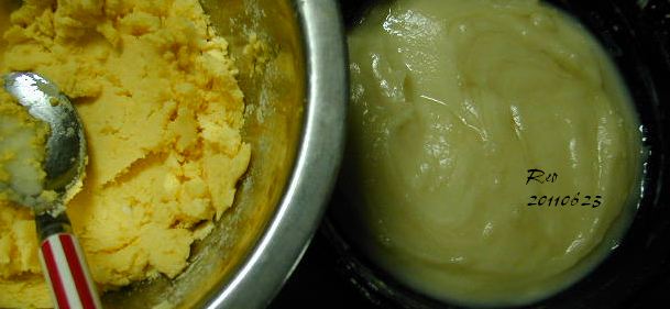それぞれに味つけをする(今回は黄身あんにはちみつ白あんには砂糖で味つけ)